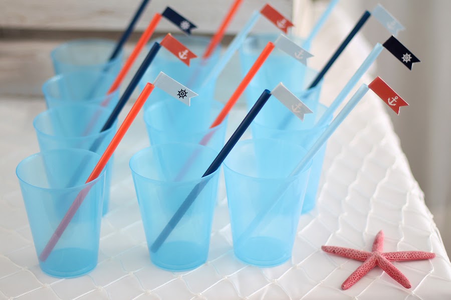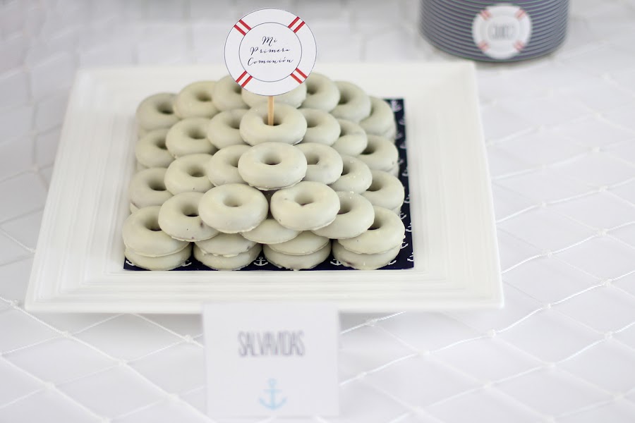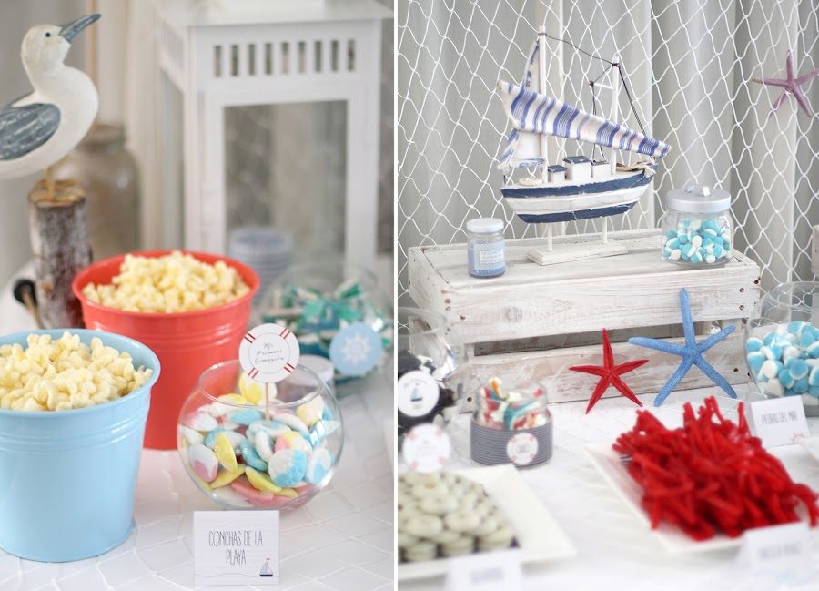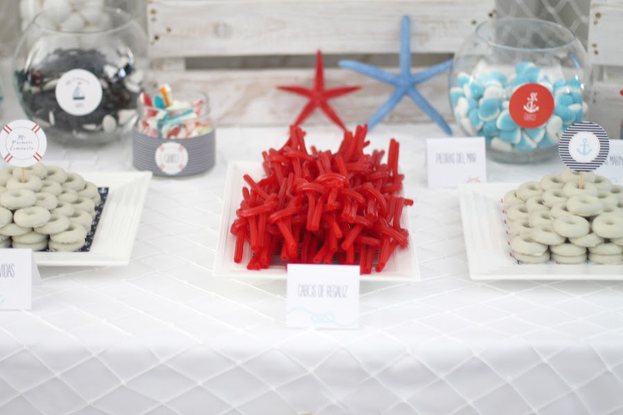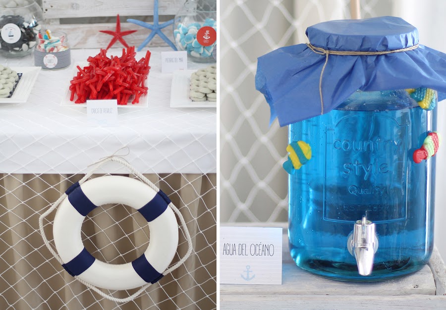 Los dulces de la mesa iban acorde a la temática: salvavidas de chocolate blanco, cabos de regaliz, tiburones del pacífico, agua del océano...