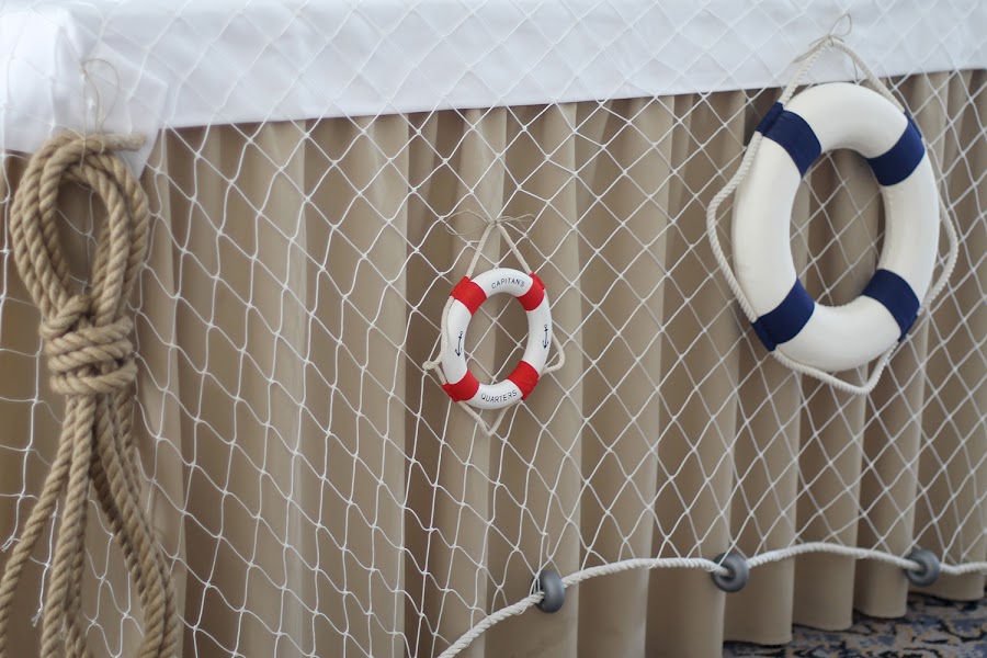 Para el fondo y mantel utilizamos una red, donde colgamos estrellas de mar y salvavidas.