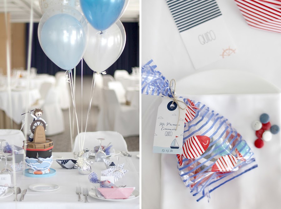 En la mesa de los niños colocamos place cards con sus nombres y sobre los platos un barquito de papel y una bolsita con chuches y etiqueta de Gracias por venir. En el centro situamos el barco personalizado que le habían regalado.