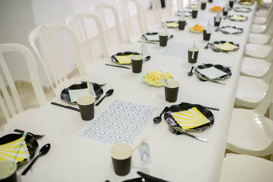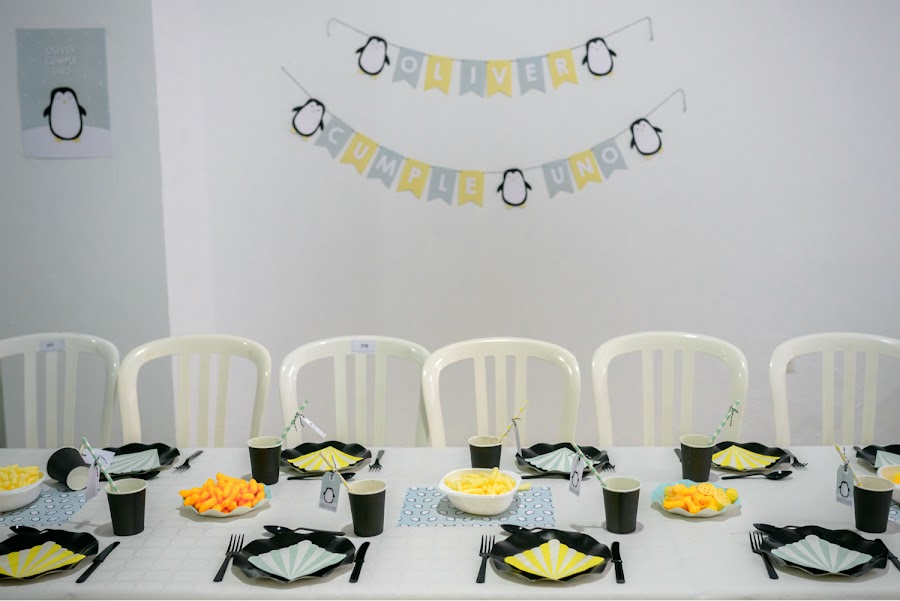 Por otro lado, una mesa larga decorada por los los salvamanteles estampados a juego con el diseño, vasitos con su etiqueta de "gracias por venir", y una guirnalda personalizada.