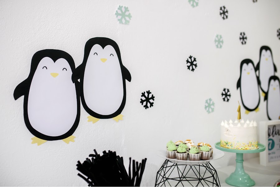 Diseñamos un cartel principal, invitaciones, figuras de pingüinos y copos de nieve para el backdrop de la mesa dulce, place cards, etiquetas para las botellas, toppers variados.