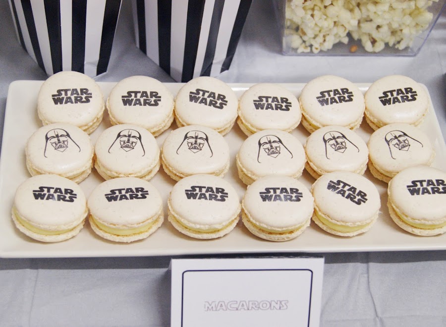 Además de la preciosa tarta, sirvieron galletas de glasa de Similam, Macarons serigrafiados de François Macaron (qué invento!), palomitas, batido de chocolate, chuches, chocolatinas...