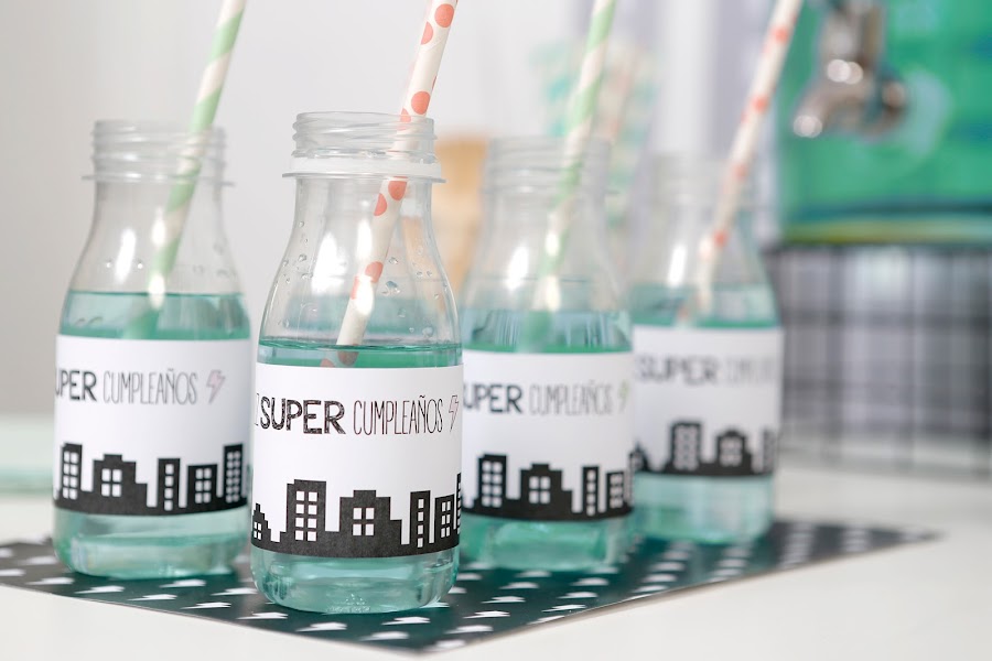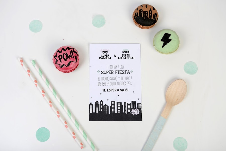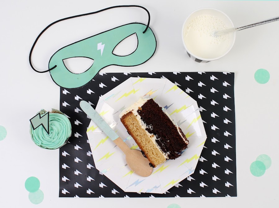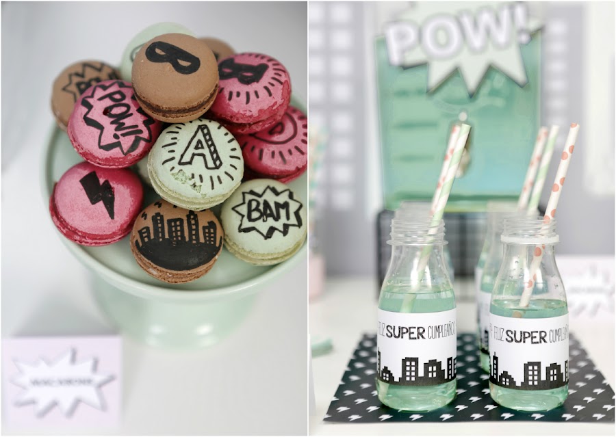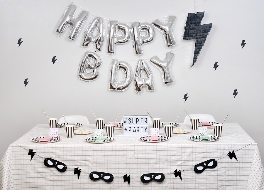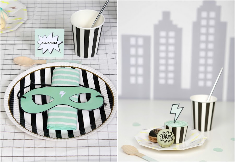 Y para la mesa de niños preparé un montaje sencillo con platos y vasos en blanco y negro a rayas, pajitas plateadas, y sobre cada plato coloqué las máscaras de superhéroes (descargable gratuito aquí) y servilletas en mint o rosa (todo el menaje de La Petite Fete).