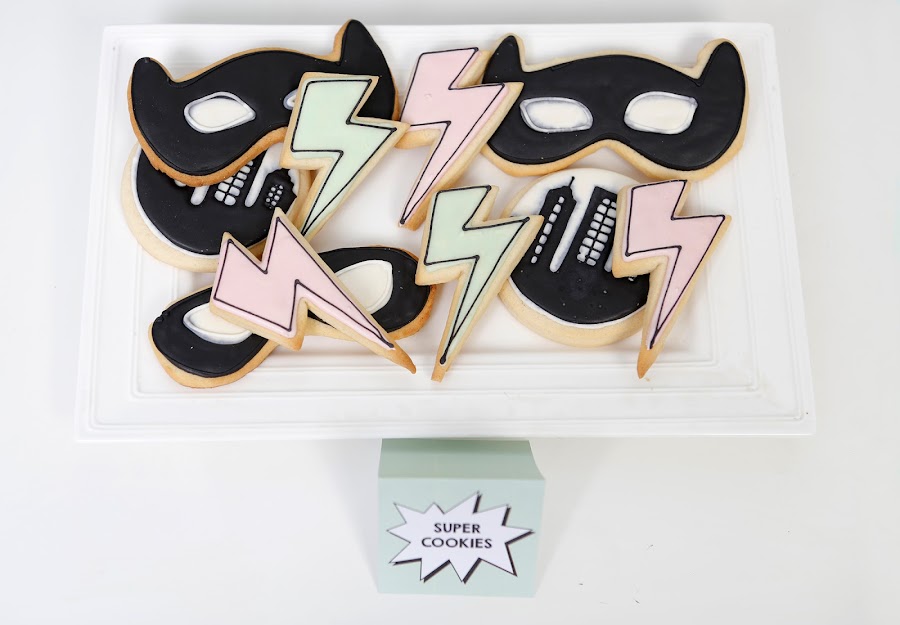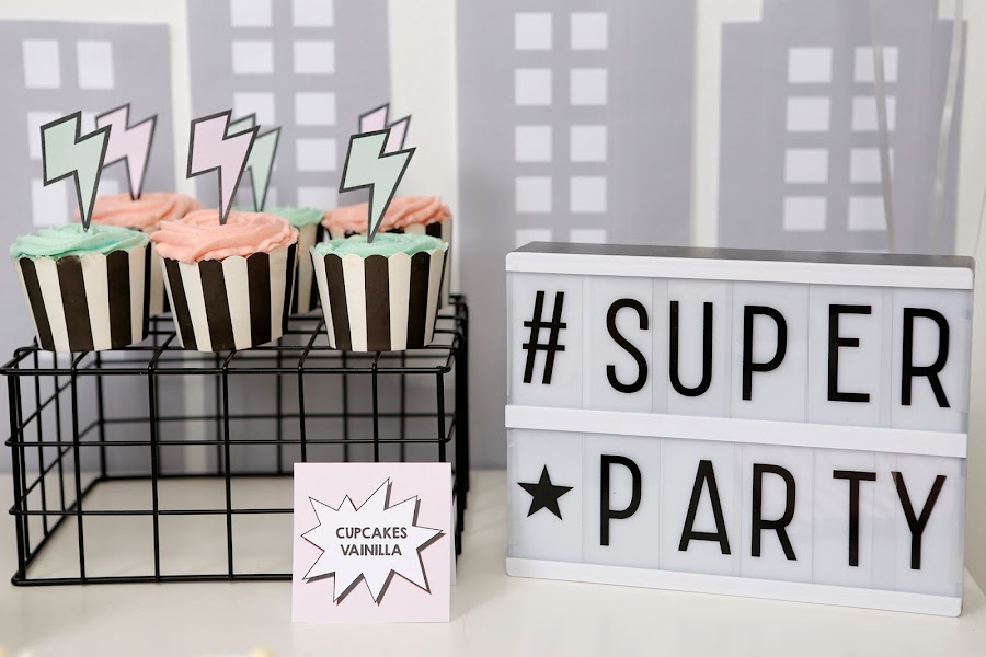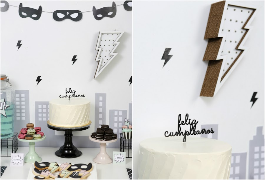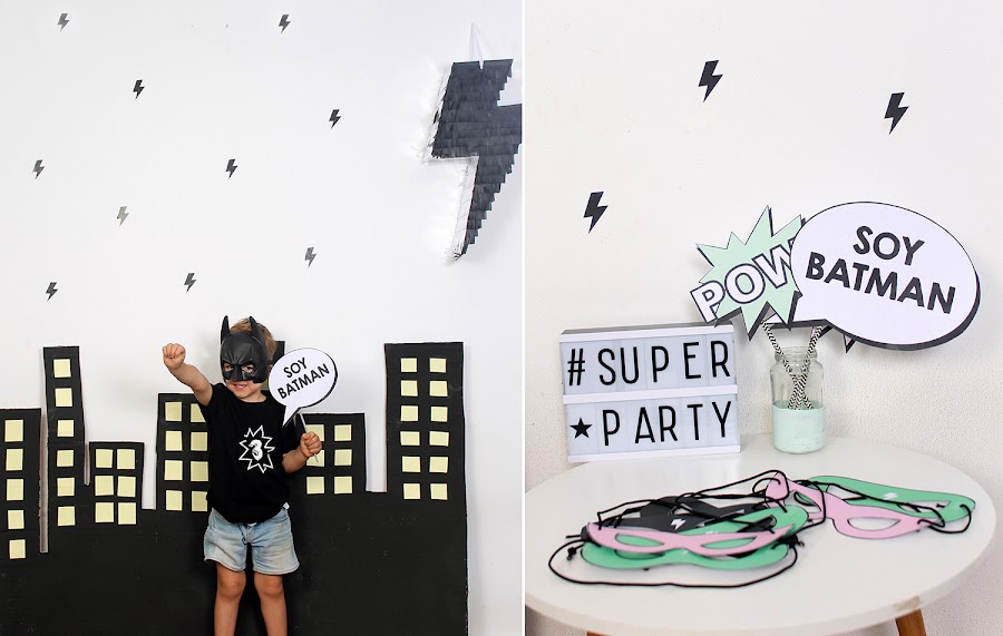 Para el photocall preparé un skyline con una caja de cartón grande y un poco de pintura pizarra. Diseñé algunos carteles con texto "Soy Batman", "Pow", "Bam" y varias máscaras.