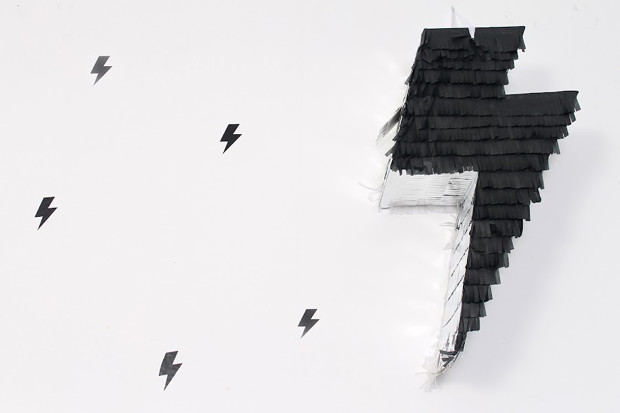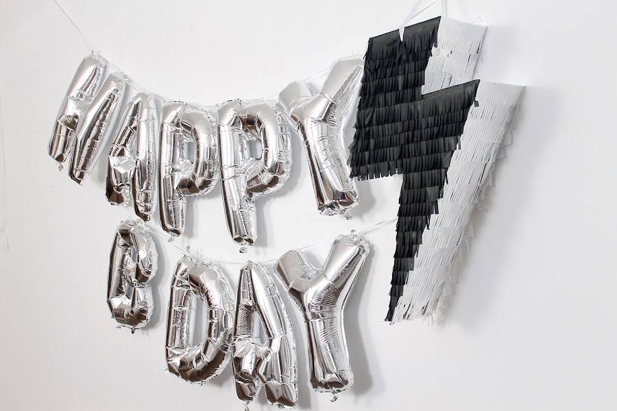 Para la pared de fondo, globos foil con el texto Happy B-day y la preciosa piñata rayo que encargué a Piñatas Web.