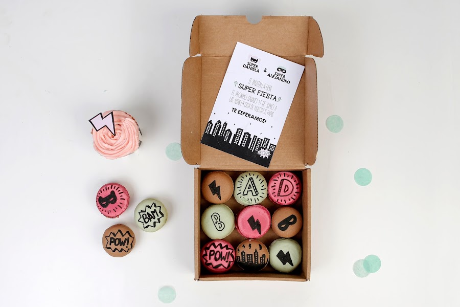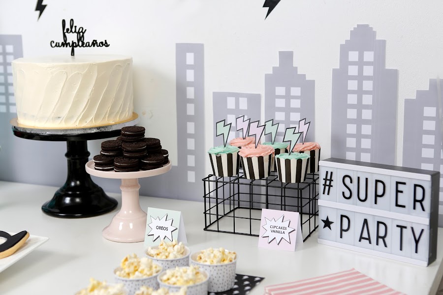 Sobre la mesa coloqué 3 cake stands centrales con la riquísima tarta oreo de American Cupcakes, macarons decorados con gráficos de comics y galletas oreo.
