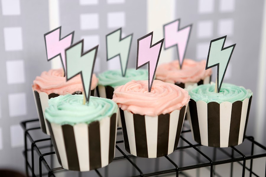 La tarde anterior a la fiesta la dediqué a hornear los cupcakes, para decorarlos utilicé toppers rayo en mint y rosa.