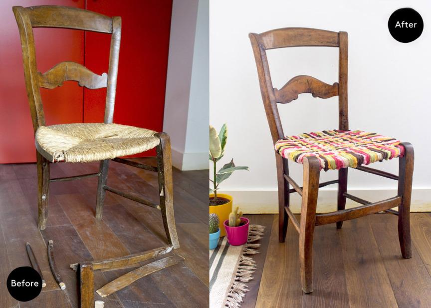 Dr. Living Home, una bonita silla de toque rustico completamente renovada y con un asiento creado con retales de telas, muy especial.