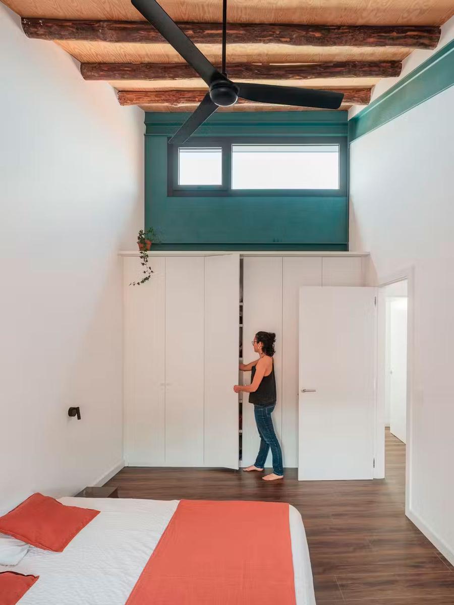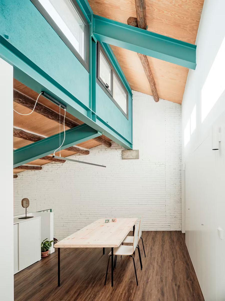 El piso de arriba es sencillo y con una decoración discreta y minimalista. El protagonista sigue siendo el bonito color verde azulado de las vigas metálicas y cómo éstas, contrastan con las viejas vigas de madera recuperadas del antiguo taller.