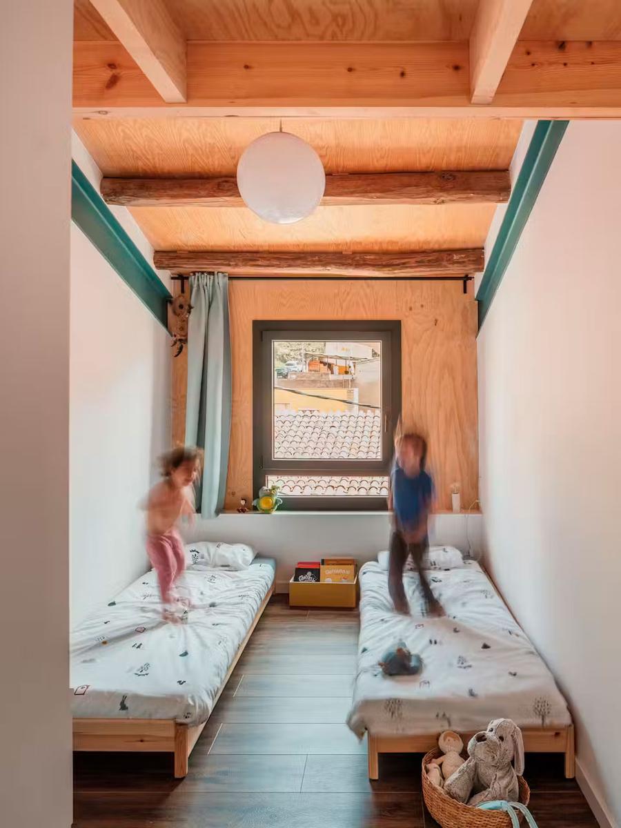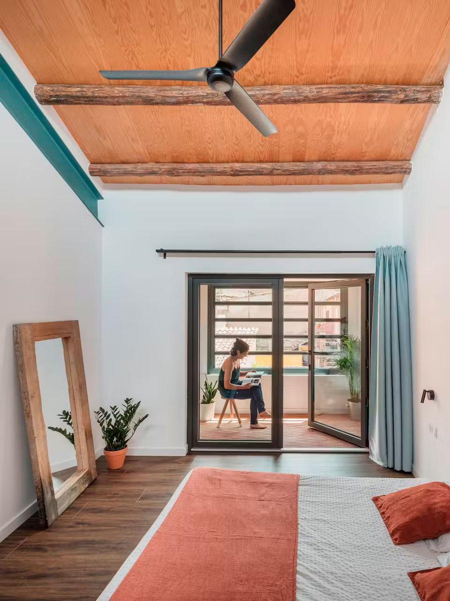 Fue necesario crear una nueva estructura metálica como forjado para el primer piso, así como la rehabilitación total de la cubierta. Para la fachada de la planta superior, se utilizó un bonito entramado de madera. Las vigas interiores, que estaban en buen estado y habían sido colocadas por el primer constructor con madera local, se reutilizaron para el techo y la madera de la antigua estructura dio paso a distintos muebles como la estantería, la mesa de comedor o el mueble del baño.