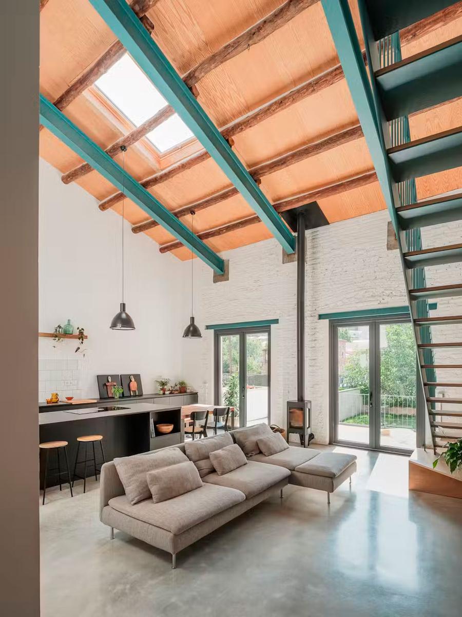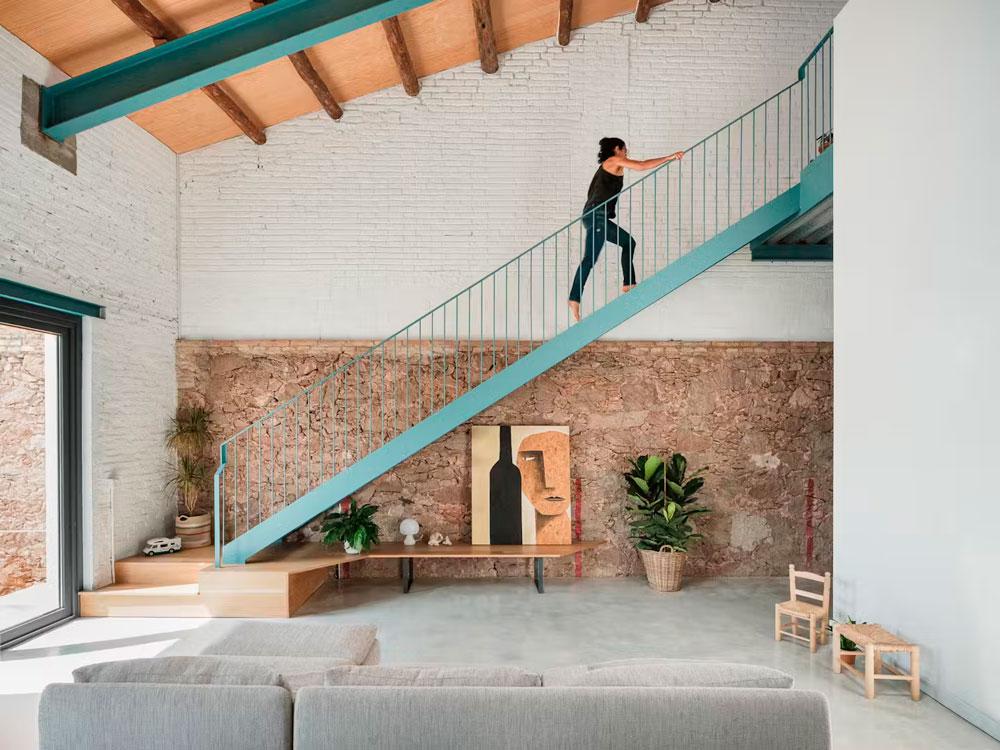 Desde la entrada podemos ver el mismo tipo de suelo para toda la planta baja, el microcemento, un revestimiento muy acorde con la historia de la vivienda. Al igual que las paredes, donde se ha mantenido la piedra y el ladrillo visto. Si algo llama la atención es la bonita escalera y las grandes vigas metálicas que atraviesan el espacio en color verde azulado, sin duda lo más original de la vivienda.