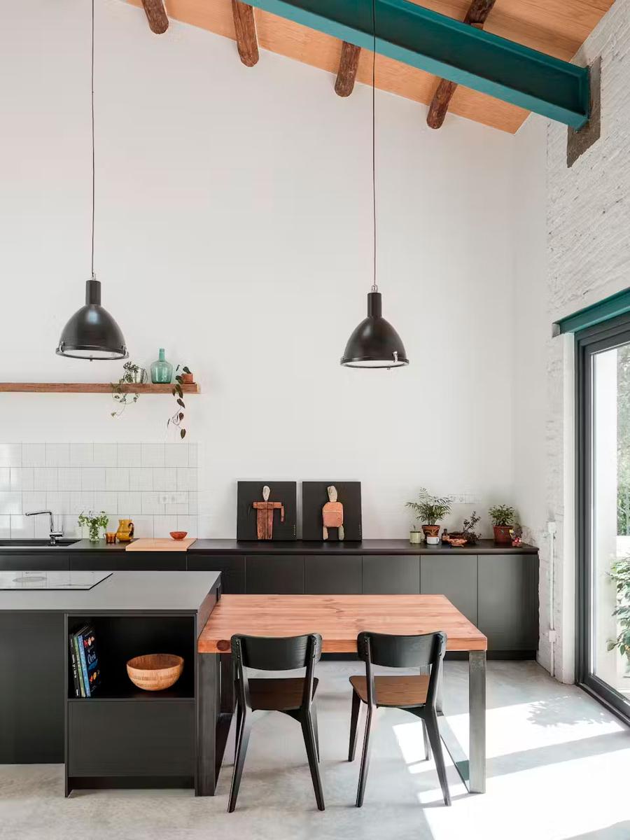 Para la cocina se utilizaron muebles metálicos en color negro que combinan a la perfección con la madera y el tono de la viguería. Una gran isla central y un solo frente de armarios bajos es suficiente para albergar todo lo necesario. Al no poner almacenaje superior, se enfatiza visualmente la altura de los techos. Para iluminar la zona de trabajo se ha recurrido a luminarias de tipo fabril, así como una tira de led empotrada en la balda que hace de separación entre la zona de azulejos y la pared (en la parte del fregadero).
