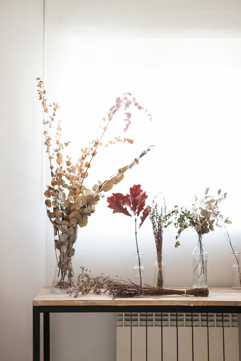 Una opción es tener siempre flores frescas y luminosas, pero cuando eso falla, disponer de algún ramo seco ayuda a crear ambiente. En zonas en las que queremos crear una atmósfera más pausada, las plantas y ramas de tonos tierra relajan el entorno. Además, lo bueno es que nos durarán mucho tiempo, no requieren más cuidado que un paño seco para limpiar las ramas y nos van a permitir jugar con las composiciones.