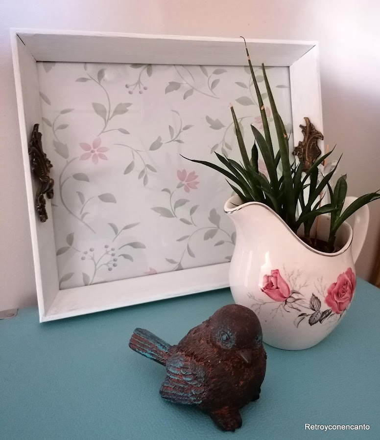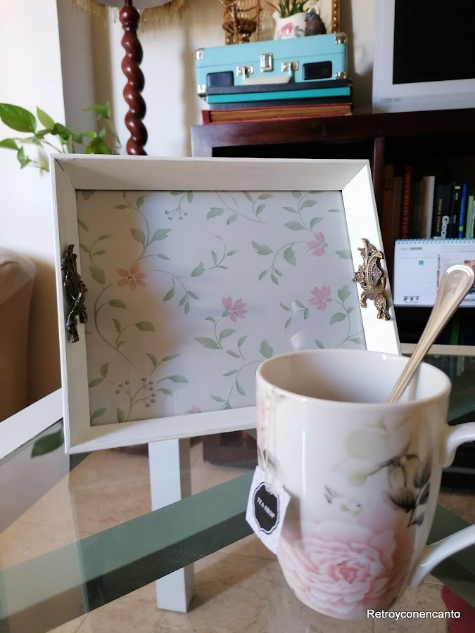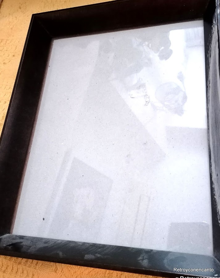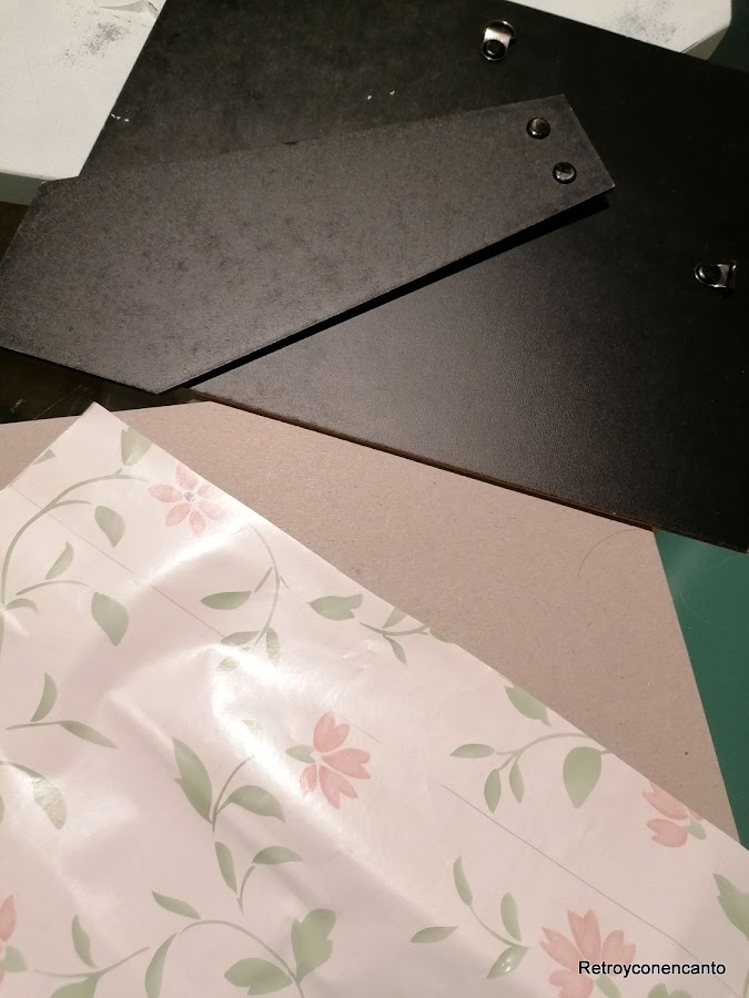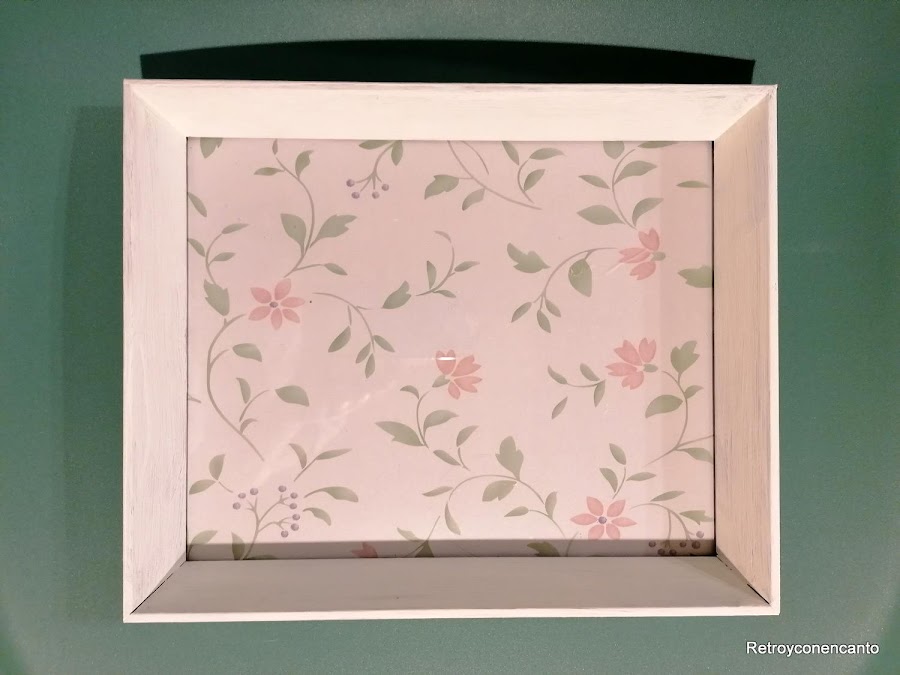 Desmontamos la trasera y decidimos usar, para el interior del marco, un bonito y floreado papel adhesivo.