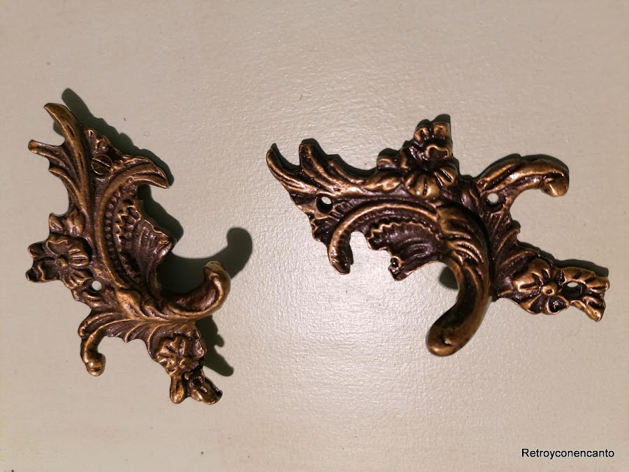 Entre los tesoros que almacenamos en nuestro taller, estaban estos dos apliques en bronce que desmontamos de un mueble destartalado e imposible de reciclar.