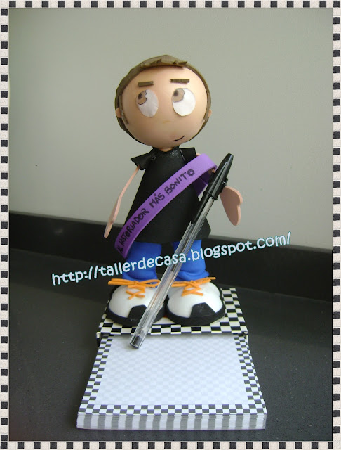 - Y para hacerlo más práctico: de base un taco de notas y un bolígrafo adherido con velcro a la mano del fofucho.