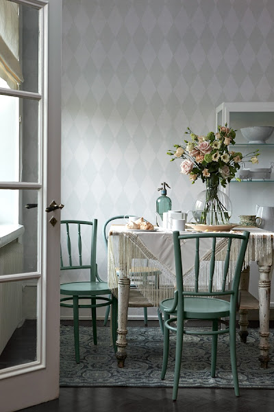 Porque el papel de pared con rombos también sirve para el comedor y porque si tienes un chal con flecos también lo puedes poner como mantel, porque ese tono de azul siempre es un acierto y porque las flores nunca te van a fallan!!! por todo eso y más.....es perfecto! Bss
