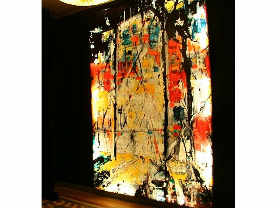 FANN quiere demostrar que la impresión es capaz de retarse a sí misma, logrando excelentes resultados sobre metacrilato, seda, piedra o metal. En la imagen vemos unas cajas de luz de 60 x 60 cm. que retroiluminan una imagen impresa en metacrilato opal, mientras que la siguiente imagen muestra una impresión directa sobre una plancha de policarbonato celular opal a la que dan luz unos tubos fluorescentes encastrados en la misma pared.