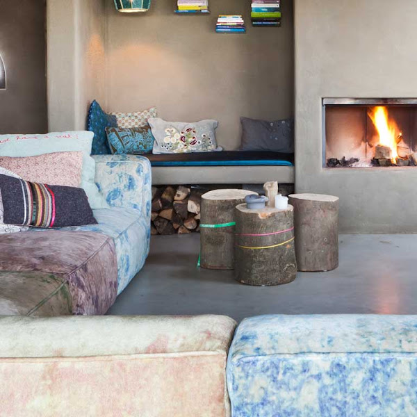 De él me gusta todo, comenzando por el microcemento del que se rodea, la mesa de centro tan natural hecha con tres troncos de madera y decorados con washi tape (¿no es genial la idea?). Y por último, la composición de sofás con estampados diferentes...