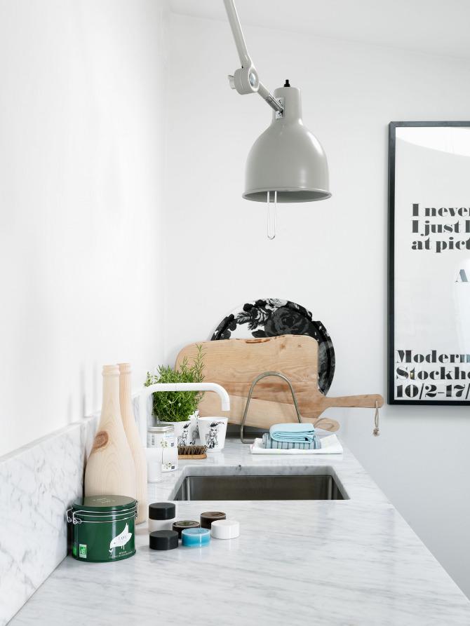 La cocina, de mármol de carrara se detalla en complementos y algún que otro detalle colgado en la pared, porque por raro que parezca...en la cocina también se pueden colocar cuadros.