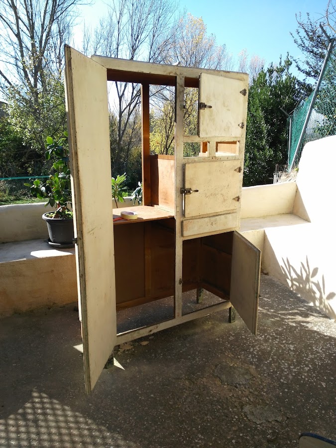 Esta es la foto que me enviaron cuando me lo ofrecieron. Lo primero que hice cuando lo tuve conmigo fué dar anticarcoma a todo el mueble . Gasté casi todo el bote. Eso te dará una idea de como estaba de polilla.