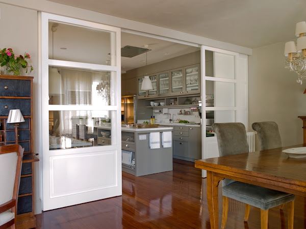 Con una disposición semiabierta, la cocina se comunica con el comedor a través de puertas correderas de cristal con marcos lacados, que permiten su comunicación visual e independizar ambos sectores cuando se necesite.