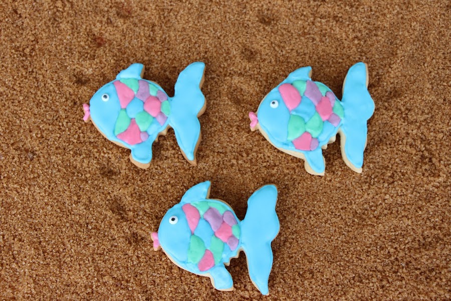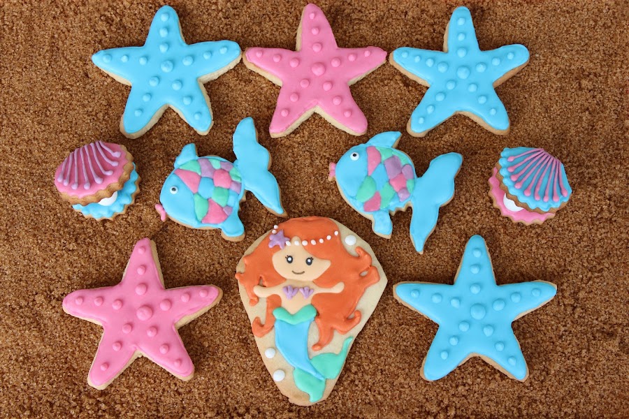 Tratándose de una fiesta de sirenas, no podían faltar galletas con forma de sirenas. Para hacerlas, primero dibujé la silueta sobre la galleta con rotulador comestible y posteriormente la rellené con la glasa.