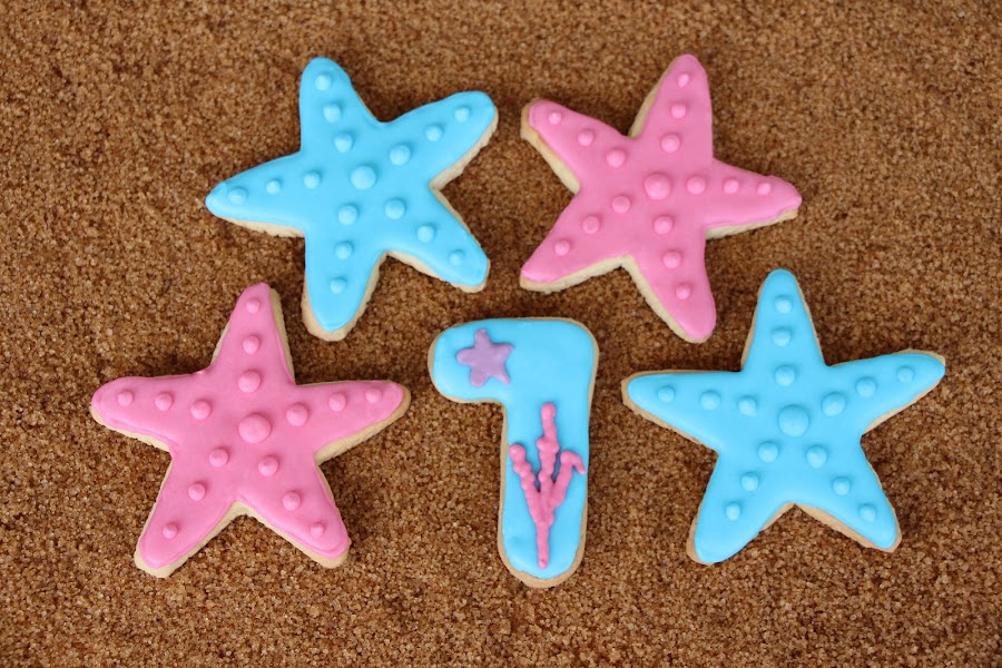 Estrellas de mar en rosa y azul, y también el número 7 decorado con un coral y una estrella