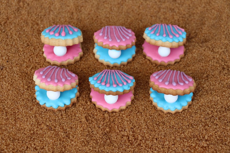 Hice ostras con su perla. Para hacer cada ostra se necesitan 2 galletas en forma de concha, las decoramos con glasa y una vez estén secas, con glasa enganchamos la perla (una bola de anís) y unimos por un costado la galleta superior con la inferior.