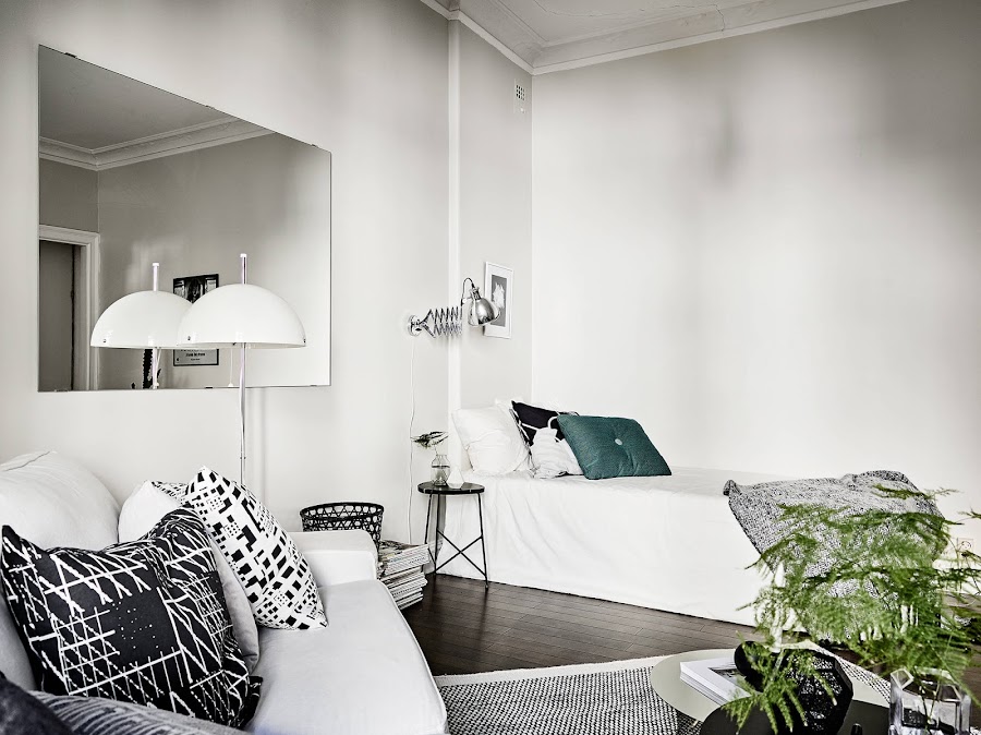 En esta pequeña casa de tan solo 37m2 también se le ha sacado partido a las paredes, y es que crear una ventana falsa es una de las mejores cosas que podéis hacer para ganar luminosidad y profundidad. Si os acordáis nosotros montamos una pared de espejos en la habitación de la antigua casa y si podemos, vamos a hacer lo mismo en la de ahora y es que la amplitud que se consigue con tan solo un espejo, es maravilloso. Para sacarle el mayor provecho, tan solo hace falta que lo pongáis donde incida la luz o simplemente delante de la ventana que tengáis.