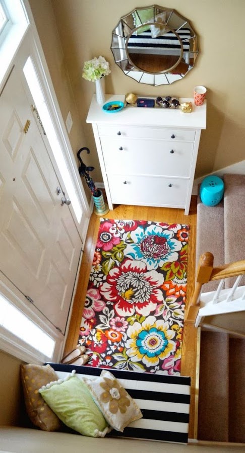 Burra para colgar los abrigos, zapatero para mantener el orden de los zapatos diarios (en la parte superior aprovechamos para añadir unos elementos decorativos y un cuenco para las llaves), dos bancos para sentarse con almacenaje extra gracias a sus amplios cajones, mullidos cojines para darle un toque de confort y personalidad, al igual que la alfombra, el look lo completa un espejo de cuerpo entero con una lámpara de pared en la parte superior. La alfombra es de Icons Corner el resto es todo de Ikea.