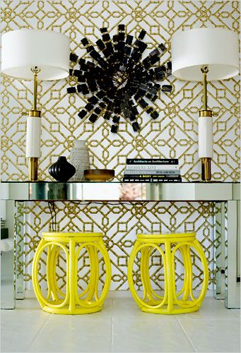 Si eres de un estilo más clásico este es tu look. Una consola de corte clásico y un espejo dorado, son las piezas principales. Sobre la consola, dos lámparas franquean el espejo. La parte más práctica de este diseño, son los colgadores de aire vintage para dejar los abrigos al entrar, y la pequeña butaca para descalzarse. El toque actual, se lo dan las cajas en cristal y dorado sobre la consola y la mullida alfombra Beni Ouarain , este tipo de alfombra lleva un par de años pegando fuerte como tendencia y ya se han convertido en todo un icono de los amantes de la decoración, (+info).