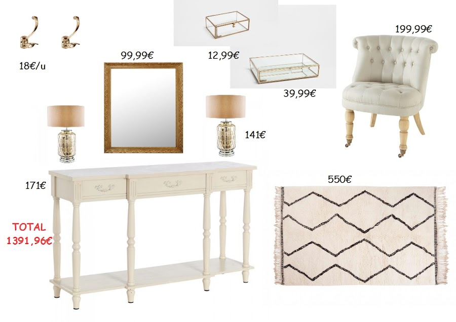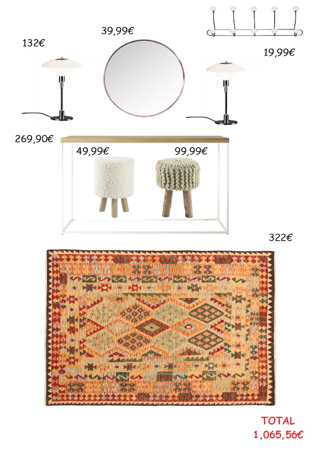 alfombra, consola, espejo, taburete 1, taburete 2, lámpara, colgador.