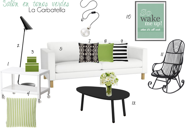 4* Cojín rayas verde 13,95?, 5* Sofá 3 plazas 359?, 6* Lámpara bombilla 52?,