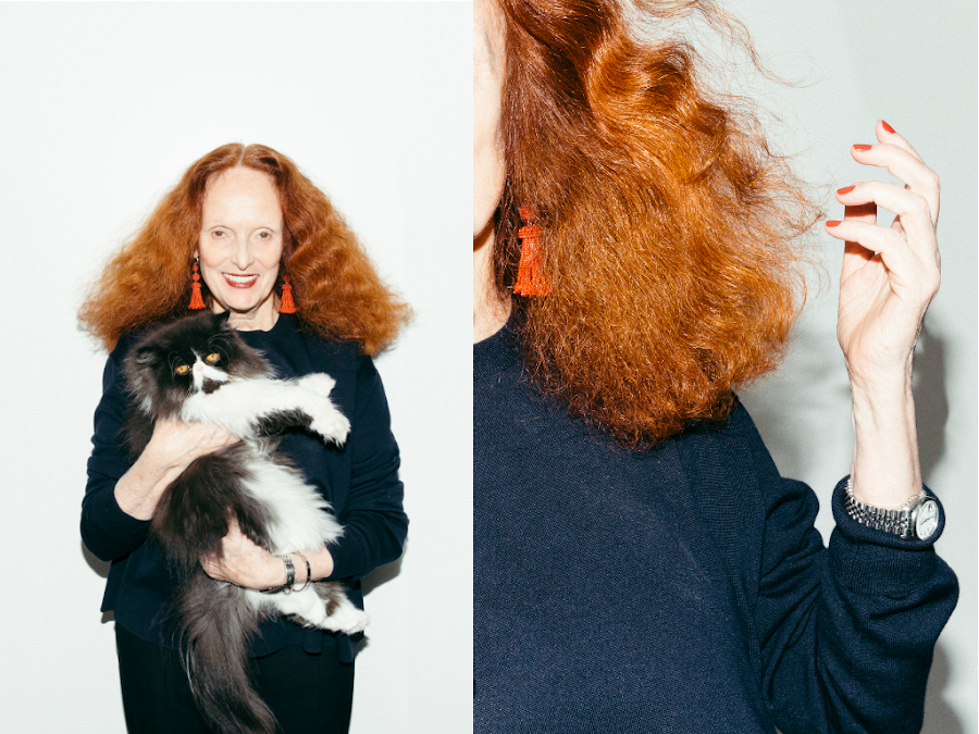 En la entrevista, Grace cuenta de su pasión por los gatos, de su evolución de estilo hacia los colores oscuros, y de cómo surgió la idea de hacer un perfume con su nombre, ahora que ya no trabaja a tiempo completo para Vogue.
