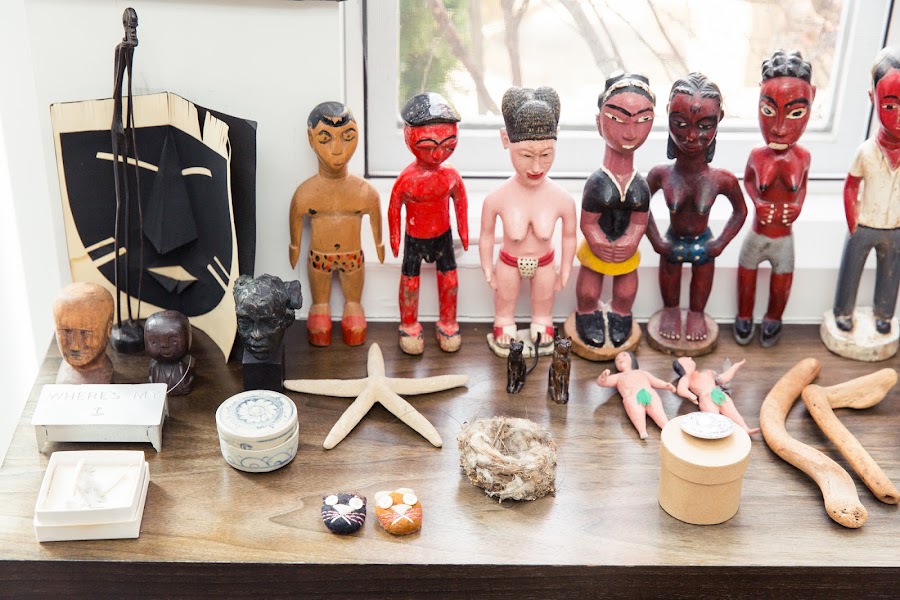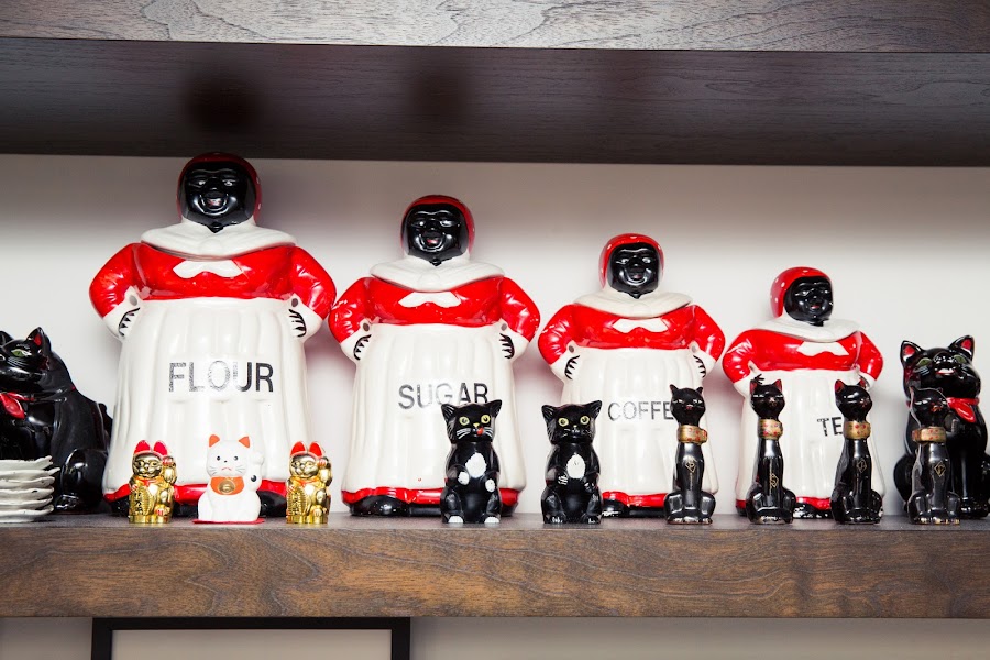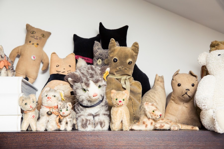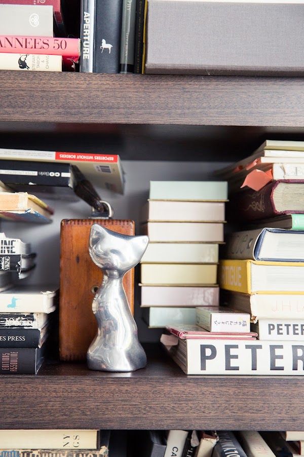 Los espacios de la casa, están llenos de colecciones! y libros, muchos libros, colocados de diferentes maneras, sobre estanterías abarrotadas, que como no...también se decoran con figuras gatunas, y otras que no lo son tanto, pero en las que se repiten los tonos cálidos y rojizos.