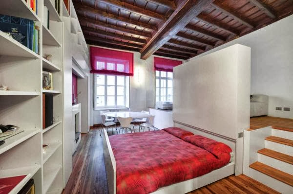 Una cama es un mueble que, cuando los metros escasean, se hace necesario ocultarla para dejar el espacio libre. Al ser una pieza que sólo se usa por la noche, se puede ocultar durante el día. Es una solución que viene perfecta para un estudio o un piso pequeño. En este caso se utilizó una plataforma elevada para disponer la zona de estar. Cuando la cama no se usa, queda escondida bajo ella.