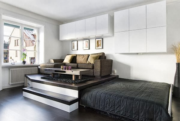 Tanto en la sala de estar como en el dormitorio, ocultar una cama o en el caso del dormitorio, una cama supletoria, bajo una plataforma que divida el espacio en dos niveles, es la mejor manera de optimizar el espacio, dejando libre la zona de dia.