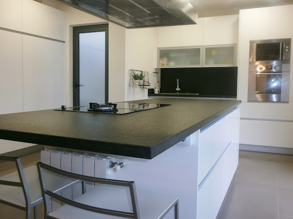 El granito negro de superficie rugosa con textura suave e irregular y aspecto envejecido le da un toque distinto a esta estupenda y espaciosa cocina. Su combinación con el modelo de sistema gola y lacado blanco satinado de puertas y cajones, da como resultado un diseño moderno y elegante, que además encaja con cualquier estilo decorativo que predomine en la vivienda.