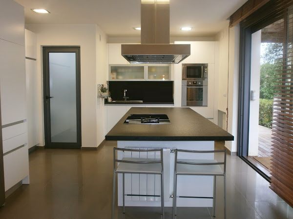 El diseño está realizado en torno a la isla central como protagonista del ambiente, donde se encuentra la zona de cocción con placa de inducción y un módulo wok de gas. La encimera se extiende a lo largo para formar una pequeña y útil barra de desayunos. Al fondo, la zona de fregadero con pared frontal del mismo granito negro, lavavajillas integrado y a su lado, columna de horno y microondas.