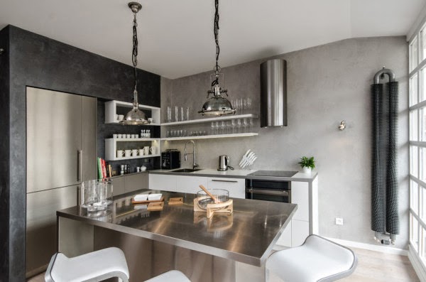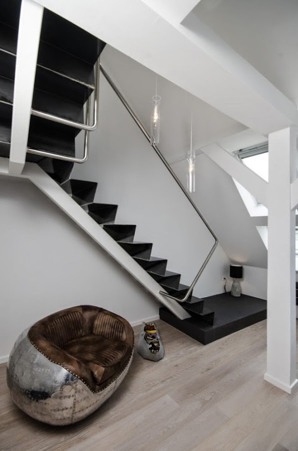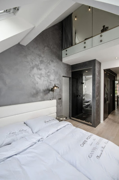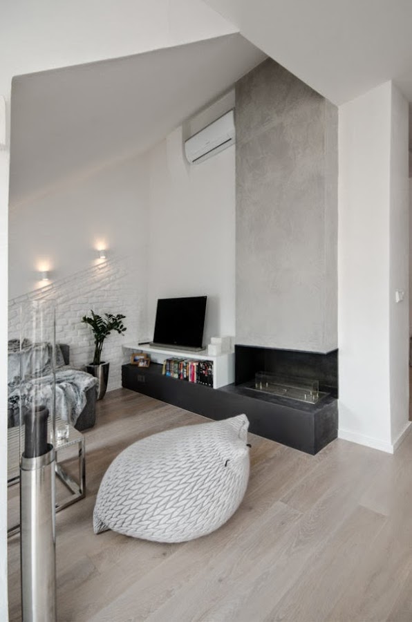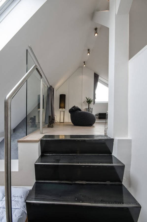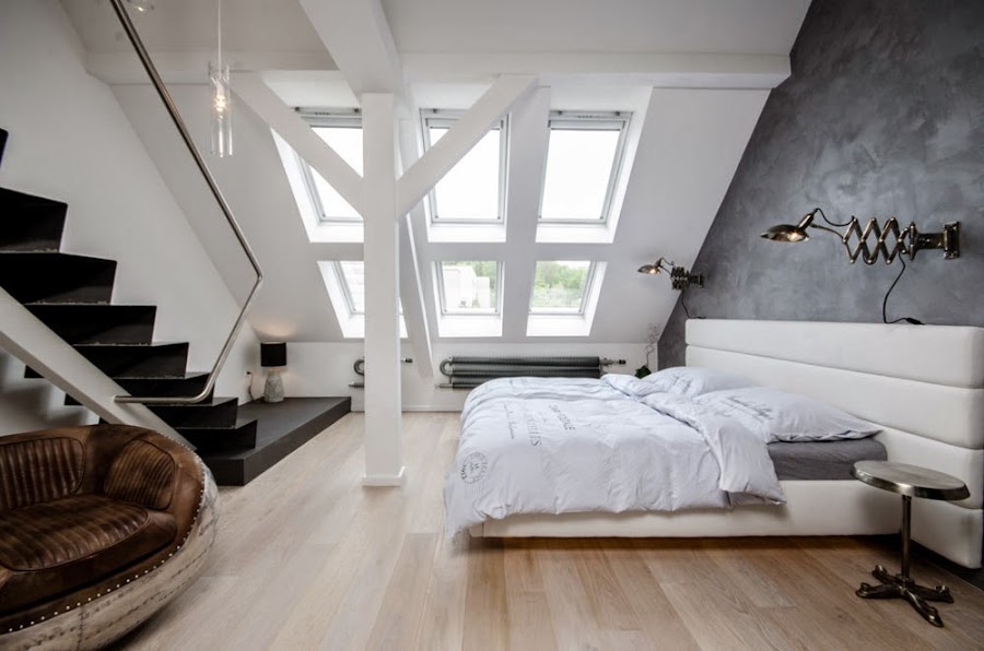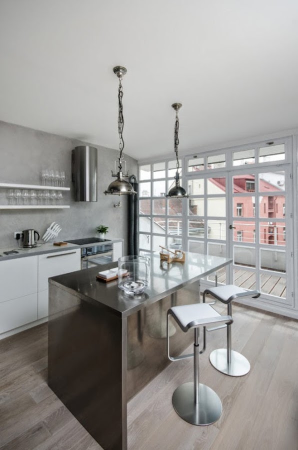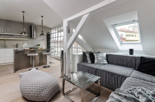 Situado en un antiguo edificio en Praga nos encontramos con este loft amplio y luminoso. Un diseño contemporáneo a base del color gris, de la madera clara y los techos blancos.