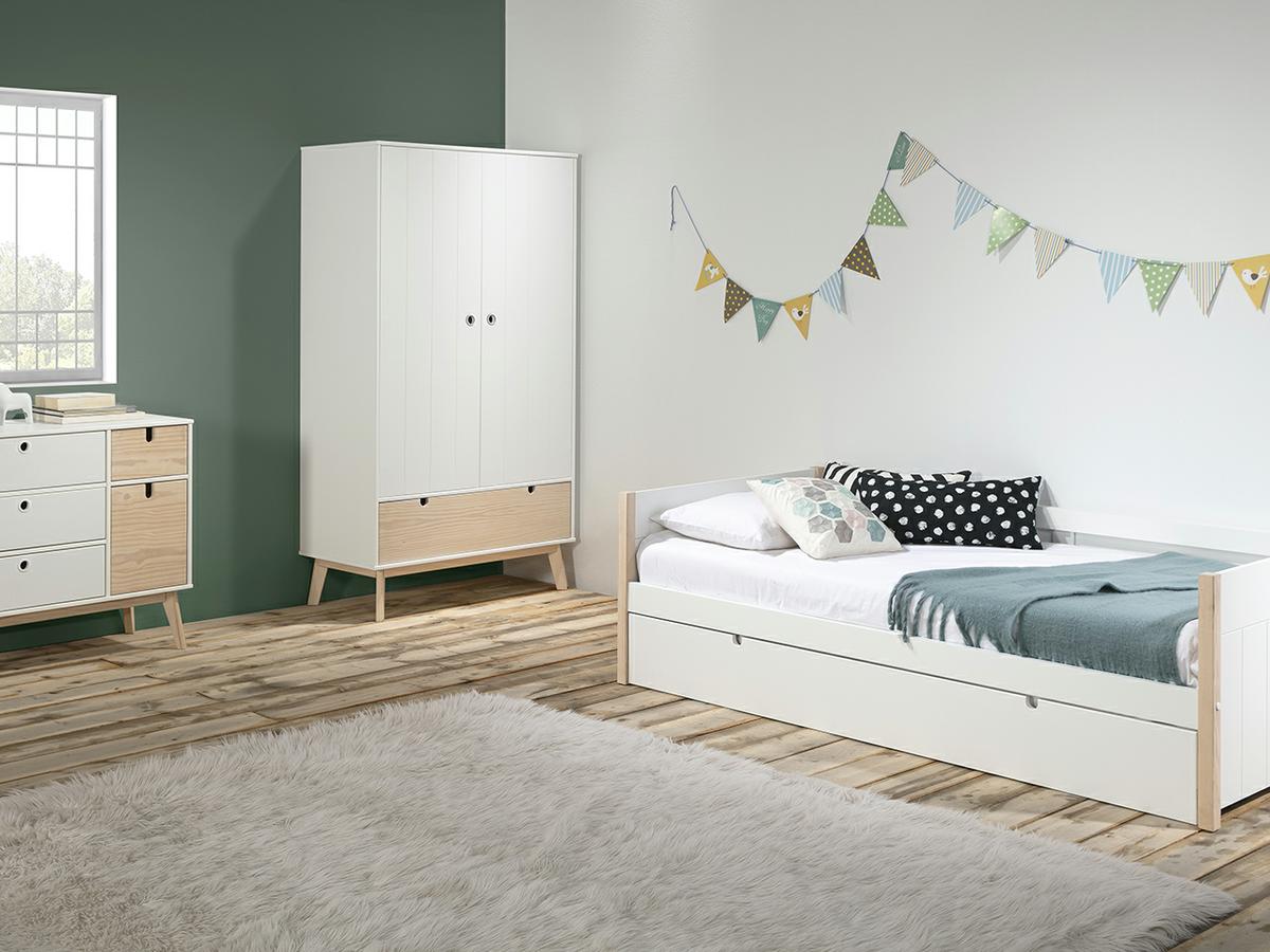 Dm/pino 98.5 x 62 x 200cmLa cama nido Clara es ideal para dormitorios asentados en espacios pequeños y donde debe descansar más de un pequeño. Esta cama cuenta con una cama supletoria que puede guardarse de día y extraerse de noche. Su estructura está elaborada en DM con acabado lacado y detalles en madera de pino. Cuenta con un somier de lamas y otro somier de arrastre elevable.