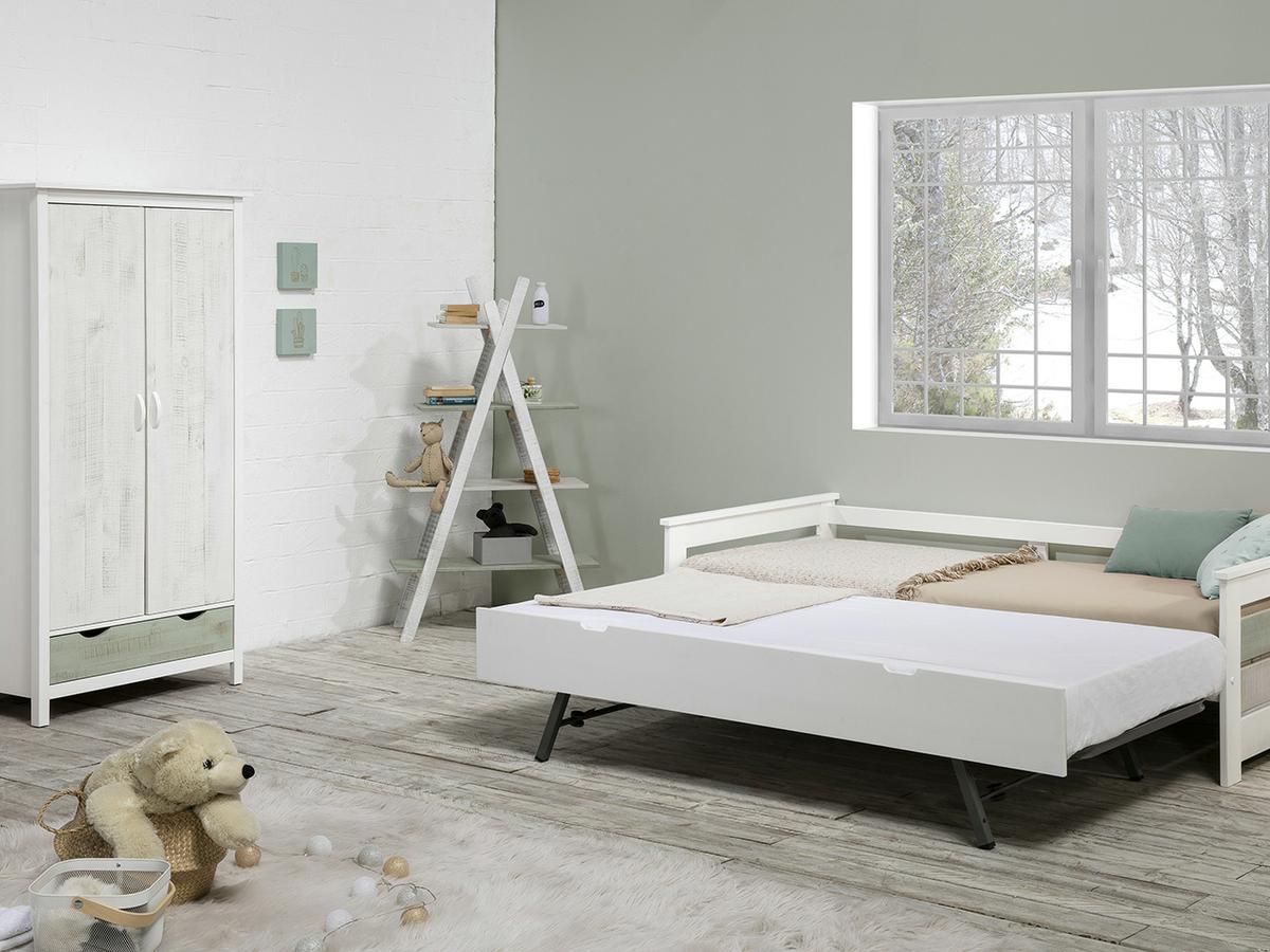 Natural/Verde 105 x 62 x 199cmCompleta el mobiliario del dormitorio de tus pequeños con la cama Ten de estilo mediterráneo. Presenta una cama supletoria en su zona posterior, la cual puede extraerse usando un par de tiradores de uñero. Está elaborada en MDF con acabado lacado en verde agua y detalles en madera de pino en el borde de sus pieceros y cabezal. Incluye somier para ambas camas, uno de lamas y otro metálico con ruedas.