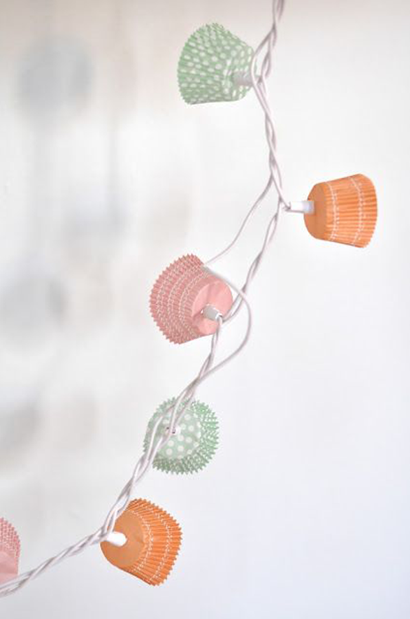 Con la misma idea que con los envoltorios de los cupcake, hacemos un corte en la base para dejar pasar la bombillita.
