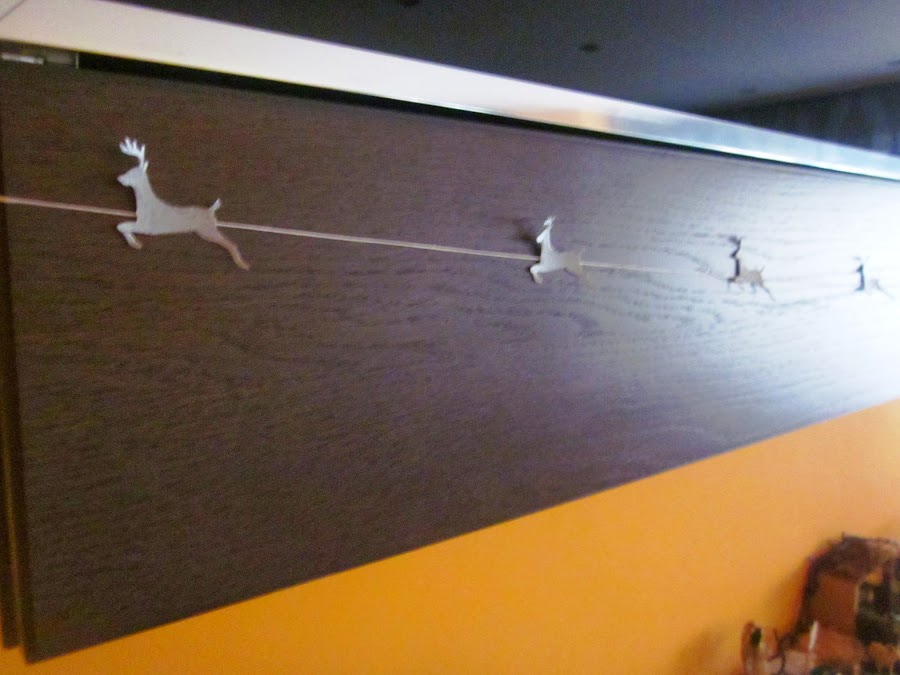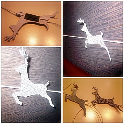 4. Corta la medida necesaria de cuerda y coloca los renos. Sujétalos con celo o con pegamento. Yo he utilizado un cordel de 2m. y renos cada 20cm.
