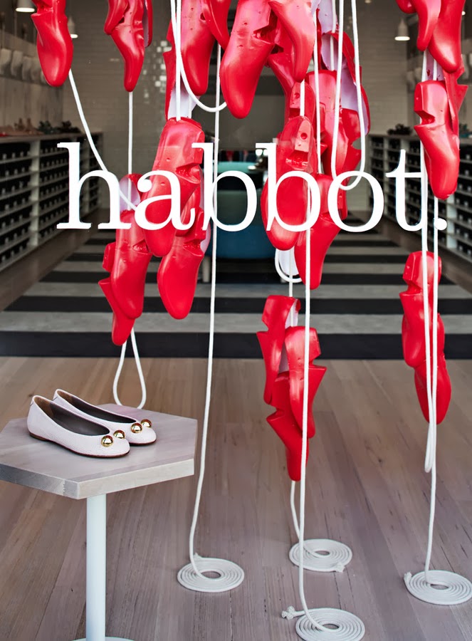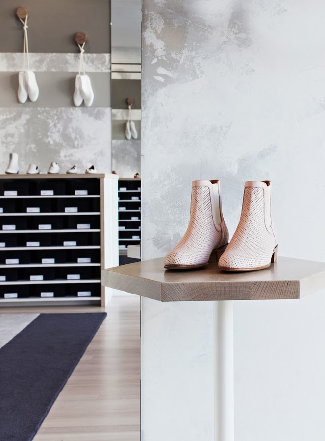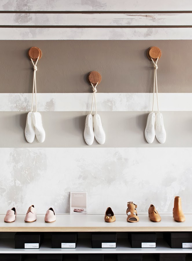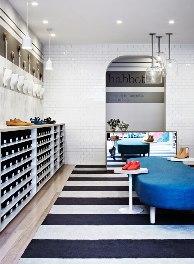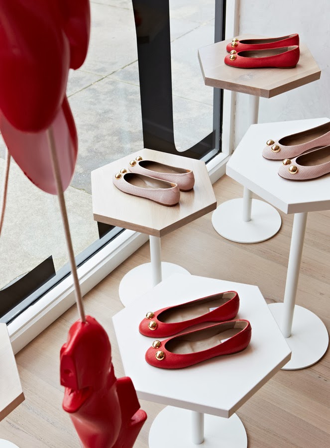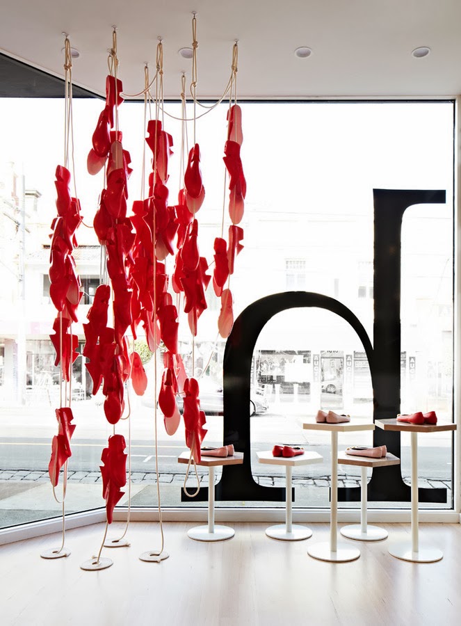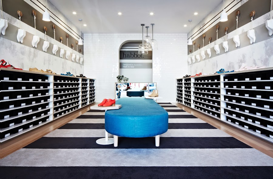 Nos encanta desde la escultura de ormas rojas de la entrada que da el punto de color y es una llamada de atención, al interior mucho más sencillo con estanterías para guardar las cajas y los zapatos organizados por gamas de color. En esta zona el color lo aporta el producto y un enorme pouf azul que preside el espacio, el resto es neutro y pero con unos materiales elegidos muy inteligentemente para ampliar el espacio y hacer que luzcan los zapatos en todo su esplendor.