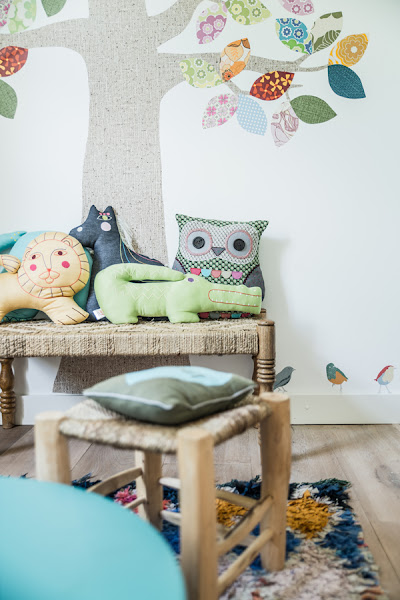 La zona de juegos está ubicada cerca del despacho de Danielle. El vinilo en forma de árbol, le da ese toque de color perfecto para motivarles e invitarles a jugar.