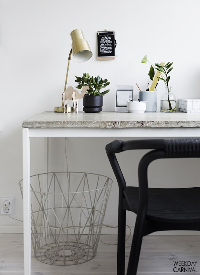 Con paredes decoradas con colgadores en madera, prácticas perchas y mobiliario by IKEA, no puedo dejar pasar la mesa DIY de hormigón, la cual por si estáis interesados en ella, os adjunto -aquí- el enlace para su construcción.