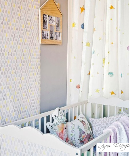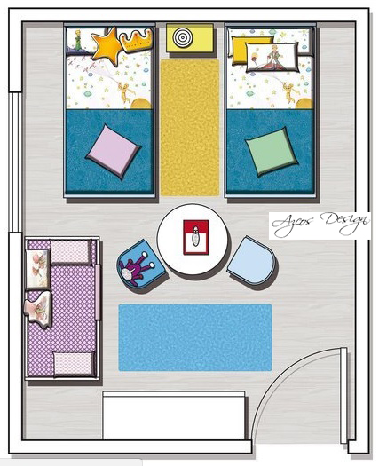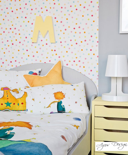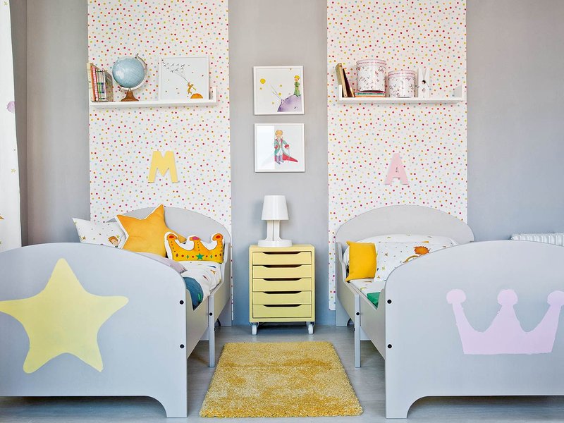 Colchas y paredes con motivos del personaje infantil el principito decoran la zona de las dos niñas mayores y gotas de agua en distintos colores pasteles decora la zona de la más pequeña.