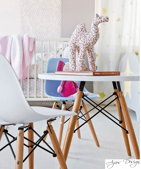 Y en el centro una zona con mesa y sillas infantiles de varios colores completa la habitación infantil de las niñas.